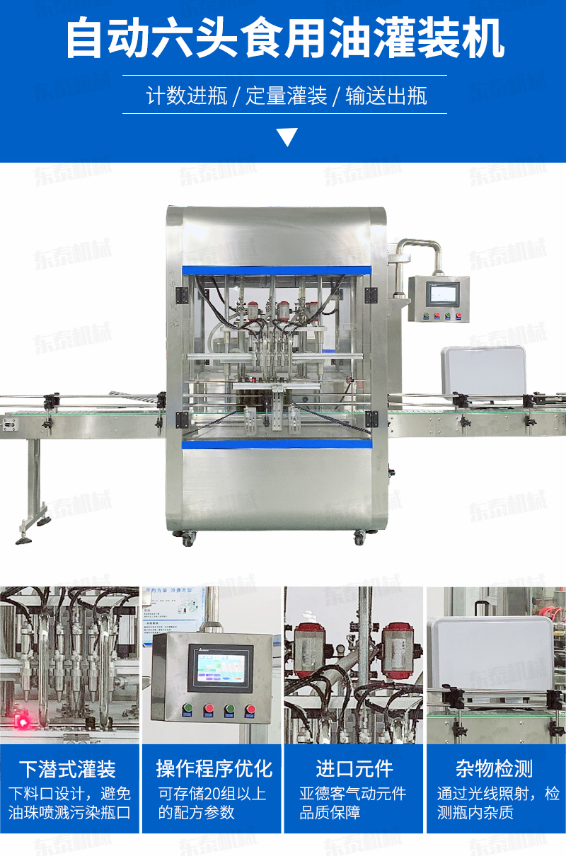 核桃油灌裝旋蓋生產(chǎn)線(xiàn)采用伺服柱塞式計(jì)量灌裝原理,適用于各種規(guī)格(0.1-1升可兼顧到2升灌裝)的南瓜籽油、榛子油、牡丹籽油、芝麻油、核桃油、山茶油、亞麻籽油、棉籽油、橄欖油、大豆油、玉米油、菜籽油等食用油灌裝。設(shè)備采用伺服系統(tǒng)定量推料,在人機(jī)界面數(shù)字化調(diào)節(jié)計(jì)量,并且可設(shè)定100ml或200ml等所需計(jì)量,觸摸屏一觸即達(dá),而且可以單頭微調(diào)計(jì)量。操作簡(jiǎn)單,維護(hù)方便,節(jié)省人工成本,生產(chǎn)效率更高。