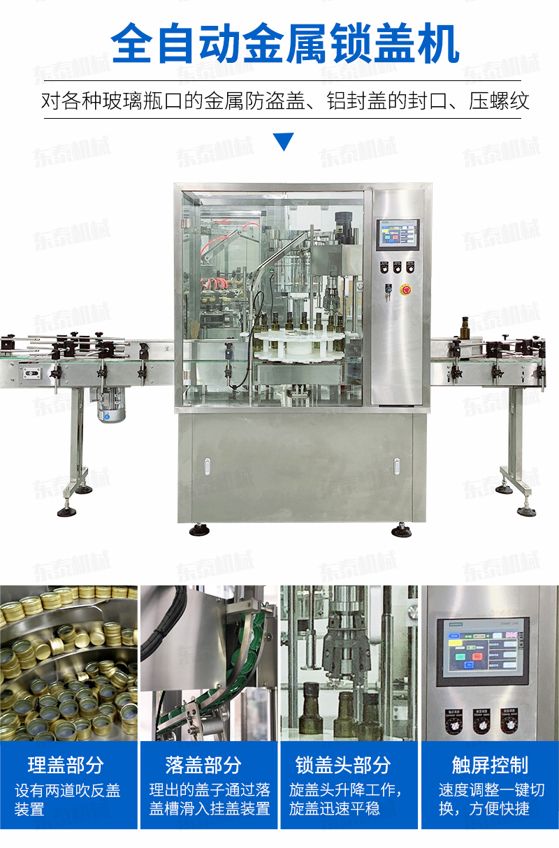本設(shè)備適用于食品、化妝品、化工等行業(yè),主要針對(duì)各種玻璃瓶口的金屬防盜蓋鋁封蓋的封口、壓螺紋等。該設(shè)備可單機(jī)使用,也可以與灌裝機(jī)等設(shè)備組成生產(chǎn)流水線(xiàn)自動(dòng)作業(yè);