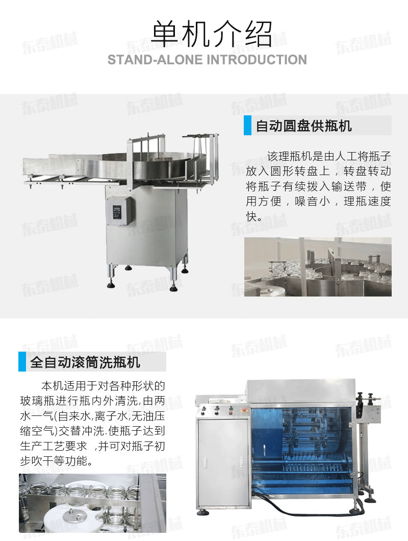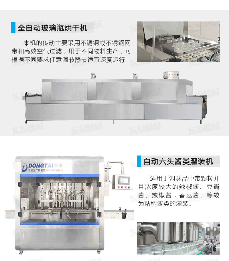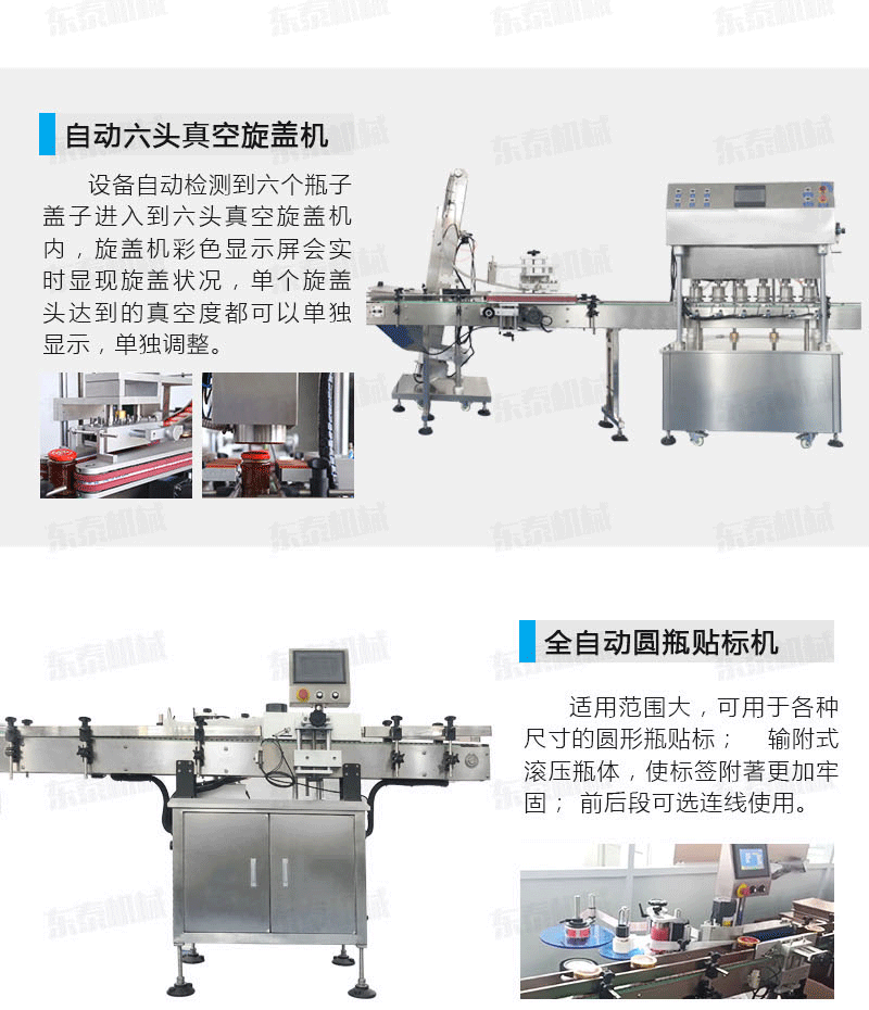 自動(dòng)供瓶機(jī)+全自動(dòng)滾筒洗瓶機(jī)+自動(dòng)六米烘干機(jī)+自動(dòng)收瓶機(jī)+全自動(dòng)六頭灌裝機(jī)自動(dòng)灌裝+全自動(dòng)提蓋機(jī)自動(dòng)理蓋、提蓋、掛蓋+六頭真空旋蓋機(jī)同時(shí)六個(gè)頭真空旋蓋+套標(biāo)機(jī)+收縮機(jī)+圓瓶貼標(biāo)機(jī)+整理平臺(tái);