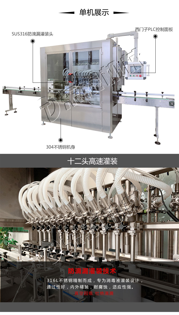 5、具有無瓶不灌裝、自動進瓶出瓶、自動定位灌裝、自動控制液位等功能,自動化程度高;灌裝嘴設(shè)計科學(xué)合理,配防滴漏裝置,灌裝不滴漏,擁有物料瓶及設(shè)備的干凈衛(wèi)生。