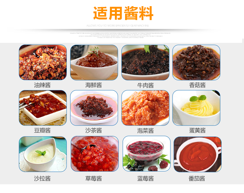 顆粒醬灌裝機(jī)采用活塞式灌裝原理,適用于調(diào)味品中帶顆粒并且濃度較大的辣椒醬、豆瓣醬、花生醬、香菇醬、果醬、牛油火鍋底料、紅油火鍋底料、蝦醬等較為粘稠醬類的灌裝。