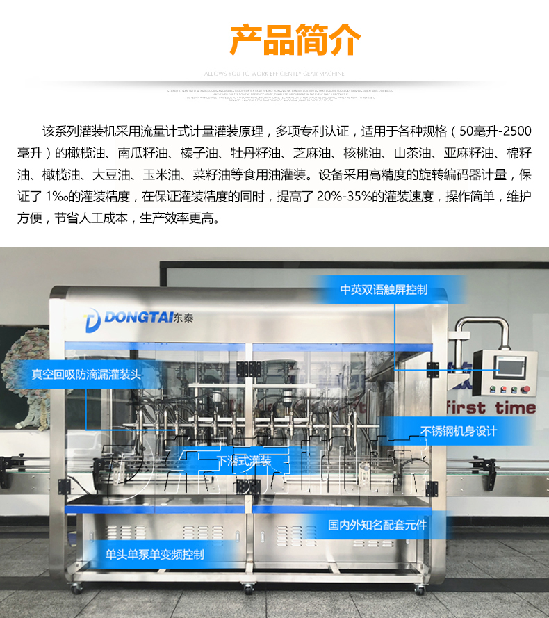 東泰機(jī)械至今有著二十年的研發(fā)生產(chǎn)經(jīng)驗(yàn),擁有著精良的技術(shù)團(tuán)隊(duì),東泰研發(fā)的橄欖油自動灌裝機(jī),橄欖油灌裝流水線都是機(jī)電一體的新型設(shè)備,橄欖油自動灌裝機(jī)計(jì)量采用高精度流量計(jì)與微電子數(shù)控儀表相結(jié)合的方式,灌裝精度相當(dāng)高,還可以方便的進(jìn)行無級調(diào)解灌裝容量,非常直觀,操作非常簡單。選擇包裝設(shè)備就要選經(jīng)驗(yàn)豐富、技術(shù)超前,設(shè)備完善的的大企業(yè),東泰機(jī)械通過二十多年的努力和發(fā)展,現(xiàn)已成為集科研、設(shè)計(jì)制造、成套供應(yīng)、技術(shù)咨詢服務(wù)、工程總承包為一體的高科技型企業(yè)。東泰期待與您的合作,我們互利共贏!